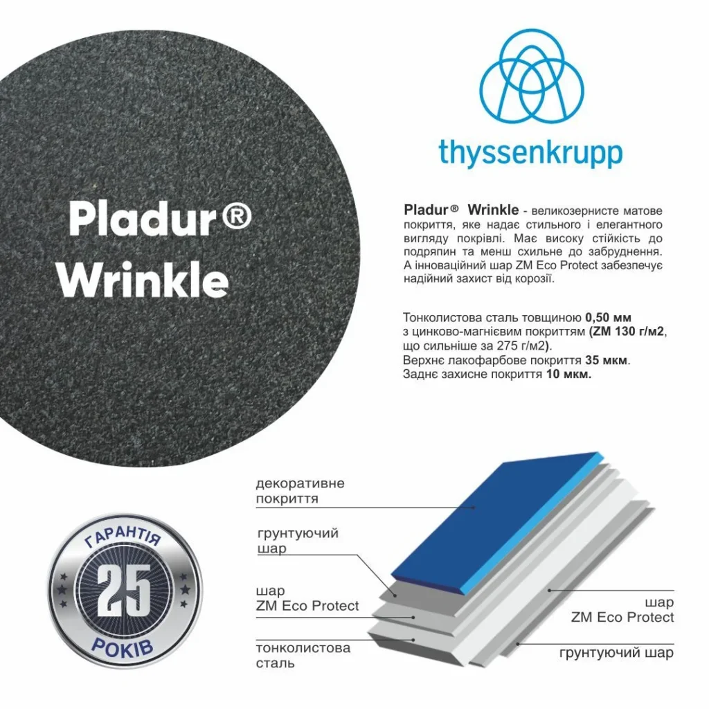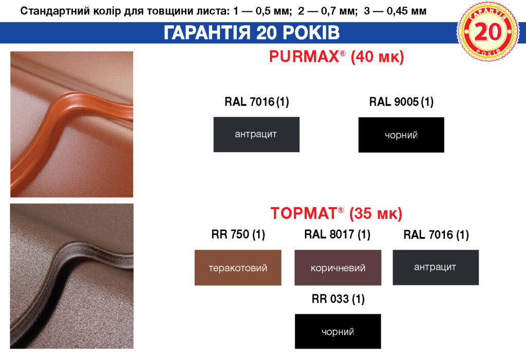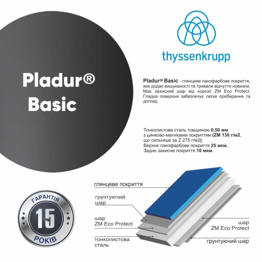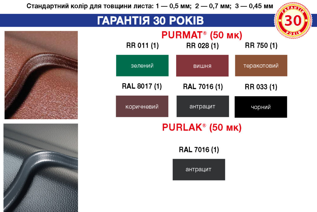 Захисний декоративний шарPE (25 мк), PEMA (35 мк) — гарантія 10 роківPurmaх (40 мк) — гарантія 20 роківPurmat і Purlak (50 мк) — гарантія 30 років