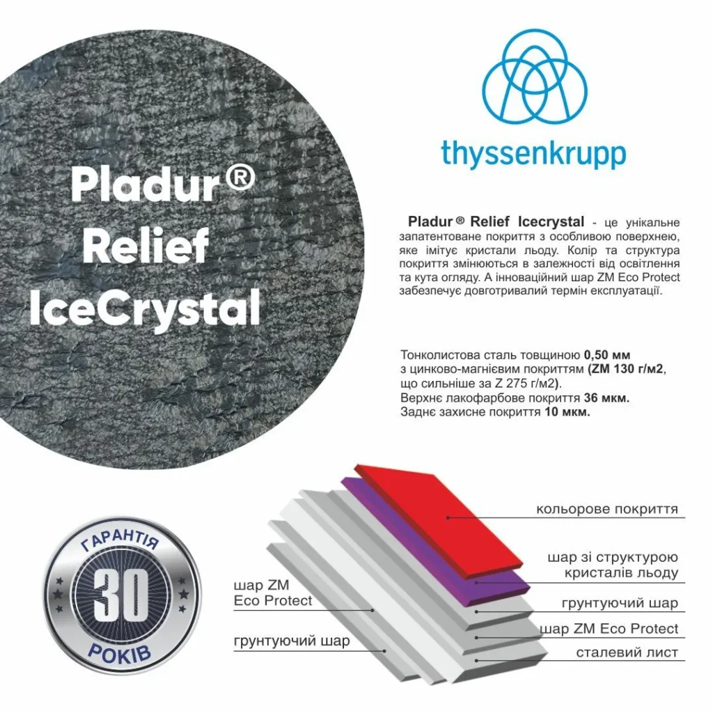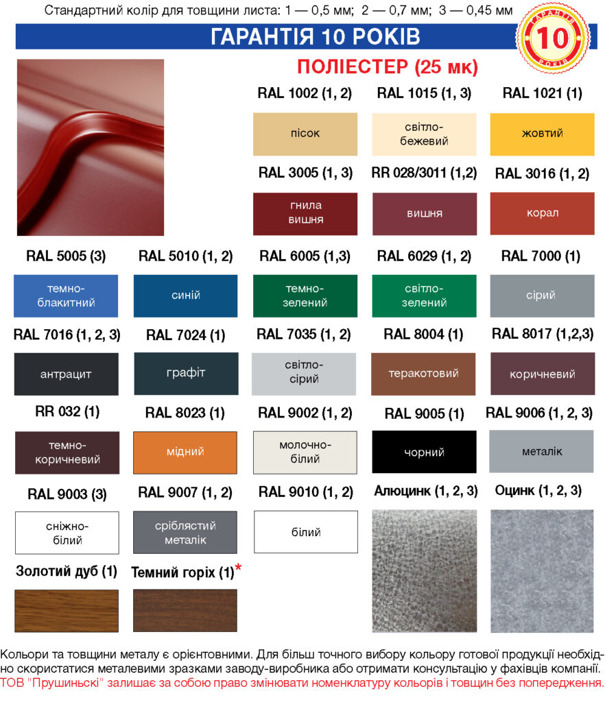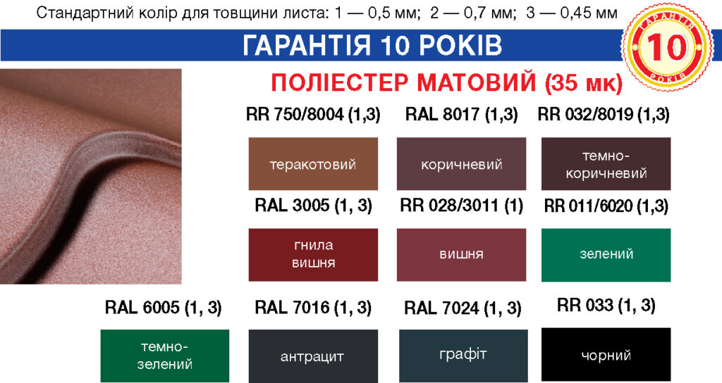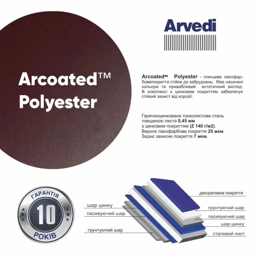Захисний декоративний шарPE (25 мк), PEMA (35 мк) — гарантія 10 роківPurmaх (40 мк) — гарантія 20 роківPurmat і Purlak (50 мк) — гарантія 30 років